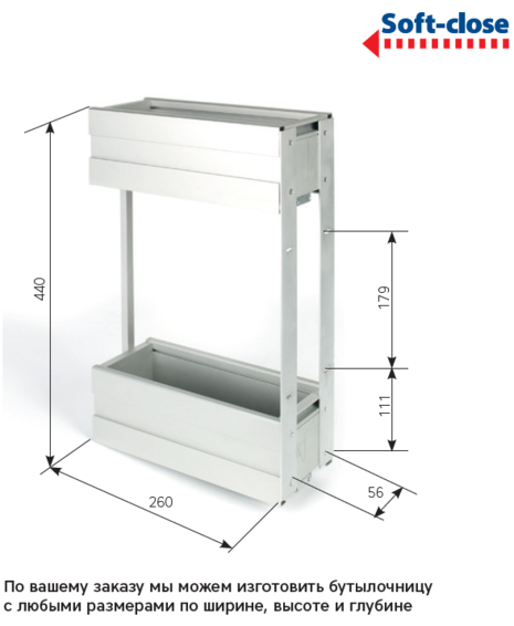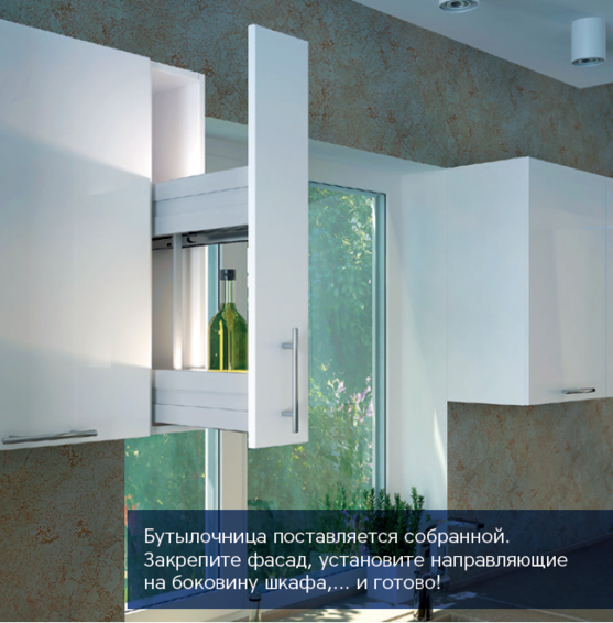 Выдвижная бутылочница с направляющими мягкого закрывания Soft-Close Функциональное оснащение узких (150 мм) ниш в навесных шкафах. Отменная жесткость конструкции. Основные элементы изготовлены из алюминиевого профиля AluMove, дно корзин — из ЛДСП. Прекрасный обзор и легкий доступ к содержимому. Элегантный современный дизайн. Полное выдвижение с мягким закрыванием. Свободно встают бутылки стандартного размера. Ширина корзины 86мм. Легко снимается с направляющих для чистки.