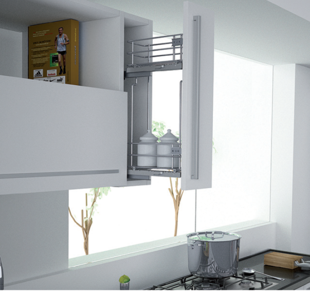 Выдвижная бутылочница с направляющими мягкого закрывания Soft-Close Функциональное оснащение узких (150 мм) ниш в навесных шкафах. Элегантный современный дизайн. Полное выдвижение с мягким закрыванием. Ширина шкафа 150мм. Возможна установка в шкаф шириной 200мм. Монтаж на левую боковую стенку шкафа. Направляющие Soft-Close в комплекте.