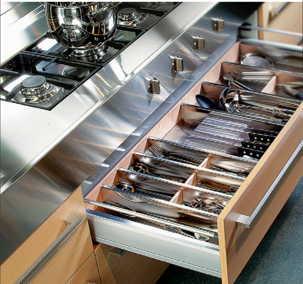 Лотки из нержавеющей стали с отделкой массивом бука для столовых приборов и посуды. Элегантное оснащение низких и высоких ящиков. Экологичный материал. Всегда порядок и хороший обзор. Легкий доступ. Одно движение и все необходимое под рукой. Для ящиков Tandem Box и Legra Box Blum глубиной 500мм.
