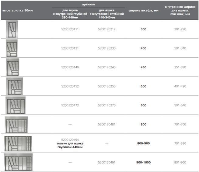 Особая прочность в угловых зонах благодаря специальной форме и особенной технологии производства. Можно мыть в посудомоечной машине при t≤50°C. Лотки из высококачественного долговечного и легкого в уходе пластика. Подходят для ящиков всех известных производителей. Простая подгонка при поточном производстве в условиях фабрики или для готовой кухни по месту. 300 (400, 450, 500, 600, 800, 800-900, 900-1000х 390-440, 440-540х 50