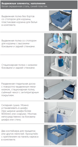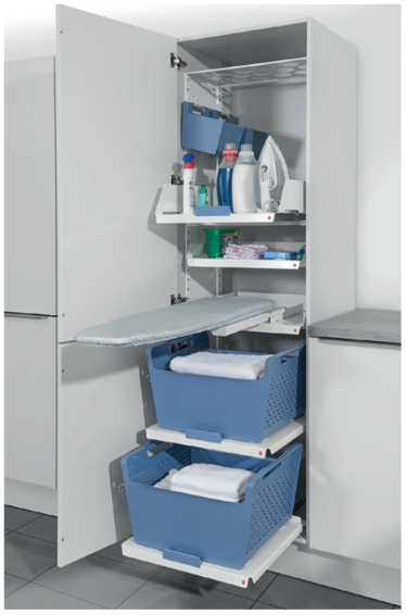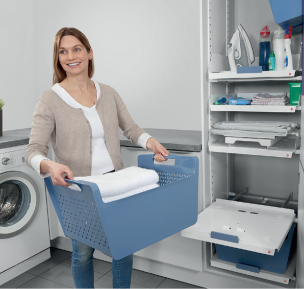 Проект «Домашняя прачечная» Система организации для шкафа шириной 600мм Компактное и функциональное оснащение высокого или низкого хозяйственного шкафа. Систему Laundry Area можно использовать, как в специально отведенном хозяйственном помещении, так, например, и в ванной комнате при наличии места. Модульная система наполнения — элементы можно добавлять по необходимости.