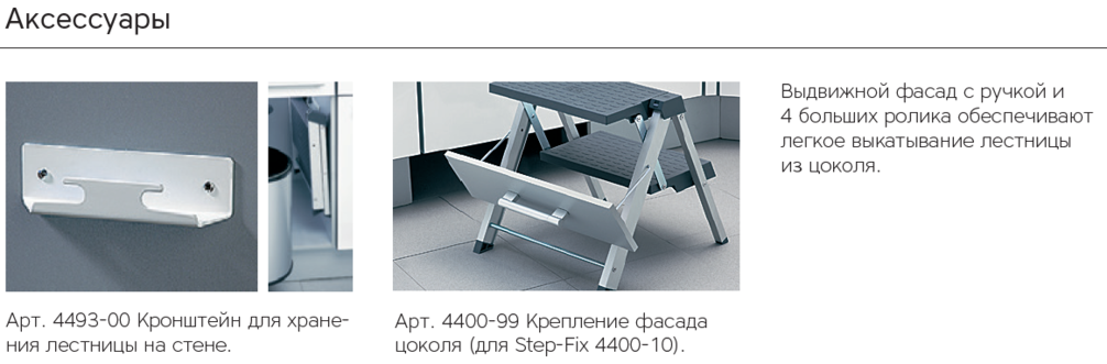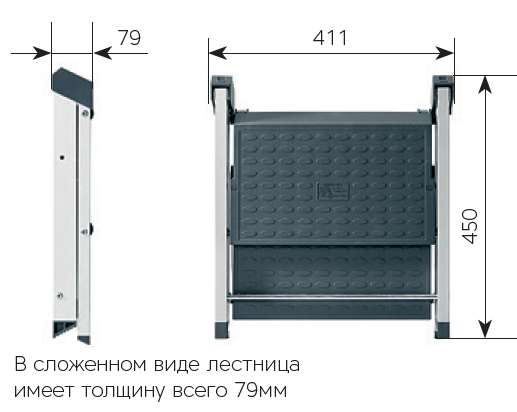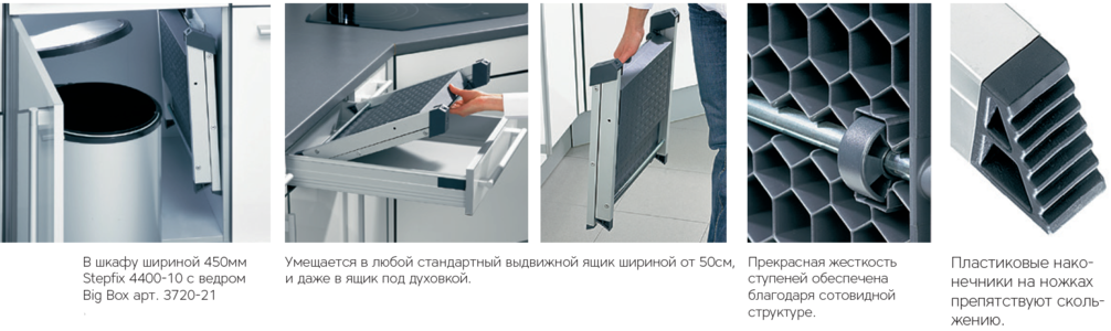 Небольшая складная лестница встраивается в цоколь кухни или компактно размещается в шкафу. Чрезвычайно устойчивая и компактная. Вы без труда доберетесь до высоких полок шкафов. Легко извлекается, легко раздвигается и всегда под рукой. Прочная стальная конструкция, 2 большие ступени с противоскользящей поверхностью, ножки с пластиковыми насадками обеспечивают максимальную безопасность. Грузоподъемность 150кг.