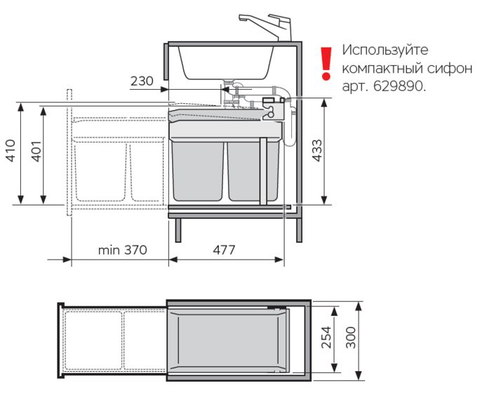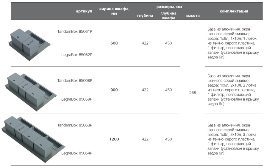 Система сортировки с 2-мя ведрами по 15 литров. Верхнюю крышку можно использовать в качестве полочки для губок и салфеток. Ведра с ручками легко вынимаются. При желании их можно использовать при уборке. Устанавливается в готовый выдвижной ящик с базой 300мм. Если пространство в шкафу под мойкой занято водонагревателем или измельчителем пищевых отходов, Вы можете поставить систему 3663-10 в ящик соседнего шкафа.Для установки в выдвижной ящик в шкаф шириной 300мм. Стационарная крышка крепится на боковые стенки шкафа, толщиной 16 или 19мм. Проставки в комплекте. Рама фиксируется ко дну ящика и к фасаду. Выдвижной ящик, направляющие, увеличители бортов приобретаются отдельно.