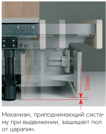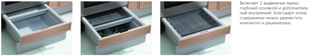 Выдвижной ящик для обустройства цокольного пространства под духовым шкафом. Теперь, задумав что-нибудь испечь, Вы не будете вынимать из духовки противни, решетки для гриля, формы для выпечки, сковороды — предметы, которые раньше традиционно в ней хранились. Они найдут свое место в выдвижном ящике, специально предназначенном для этого. Фактурная поверхность дна ящиков препятствует скольжению хранимых предметов в процессе движения. Система оснащается направляющими DWD XP Grass с встроенной функцией Soft-Close грузоподъемностью 40кг.