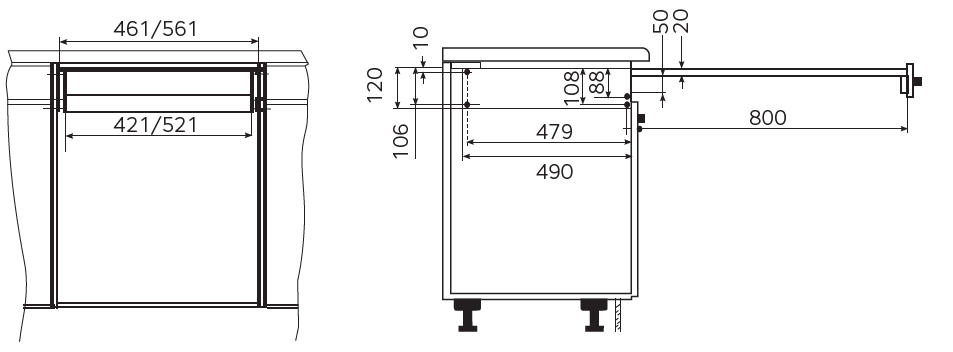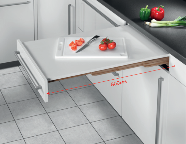 Выдвижная столешница. Легкое расширение рабочего пространства кухни. Надежные направляющие из массива бука выдерживают значительные нагрузки до 100кг. Rapid выдвигается на 800мм! Это возможно благодаря тому, что задняя часть столешницы состоит из ламелей, которые в процессе задвигания скручиваются в рулон.Ламинированное покрытие повышенной износоустойчивости надолго обеспечивает легкий уход и эстетичный внешний вид.