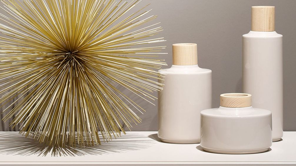 Декоративный сосуд Woody из керамики с отделкой деревом. Разные цвета и размеры. Материалы: Керамика, Дерево. Размер H.12см x ø 17.5см.; H. 25см. x ø 14см. ; H. 34см. x ø 11см.