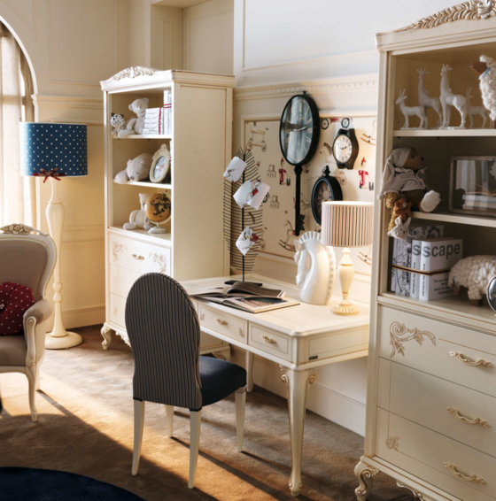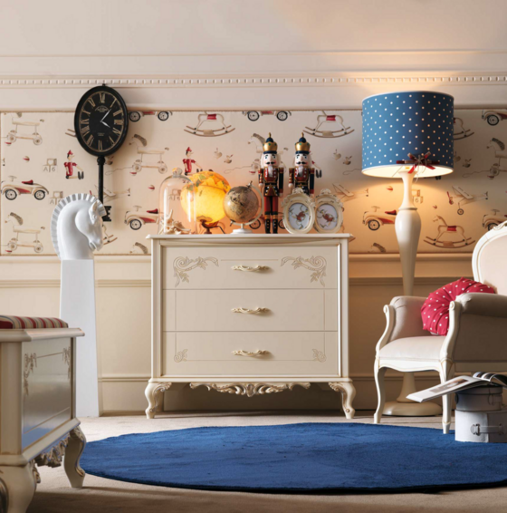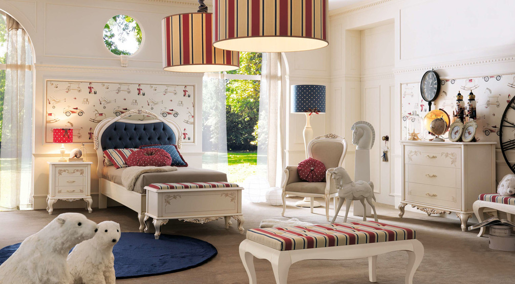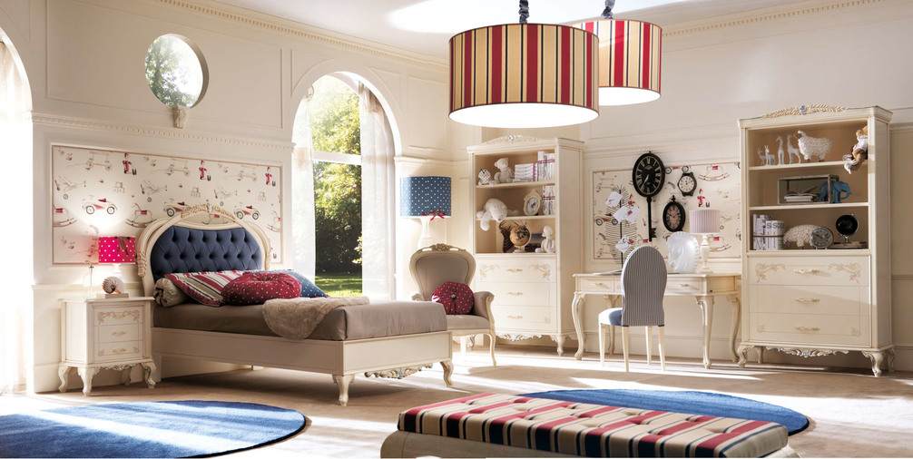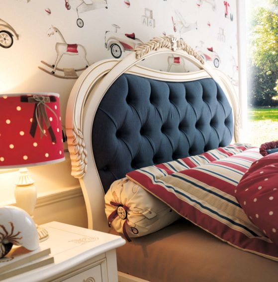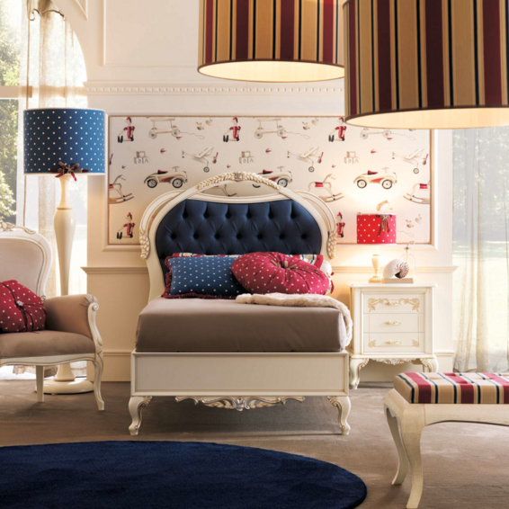 Мир прекраснее в цвете! Яркие цвета, по сути, являются ключом к веселому, поднимающему духу этой спальни. Кровать с изящно вырезанным изголовьем и декоративными узорами по центру и по бокам идеально сочетается с обивкой капитоне из ткани темно-синего цвета. Шкаф, комод и тумбочки покрыты порошковым лаком и украшены элегантными рисунками, которые подчеркивают мастерство ручной работы.