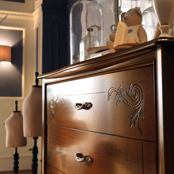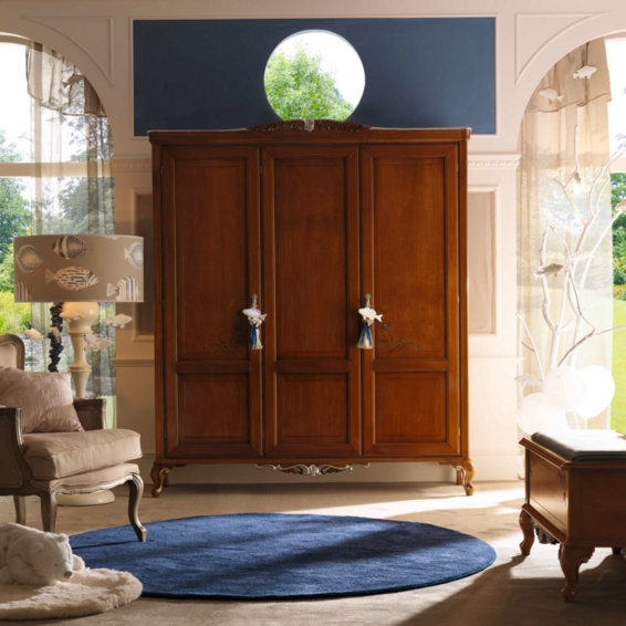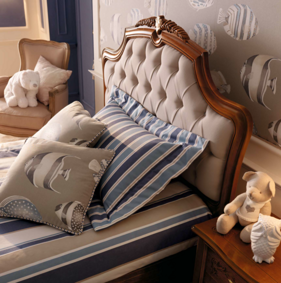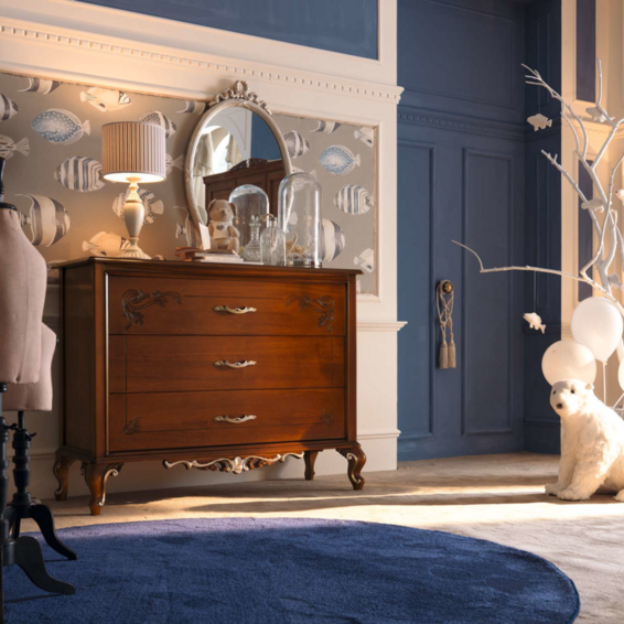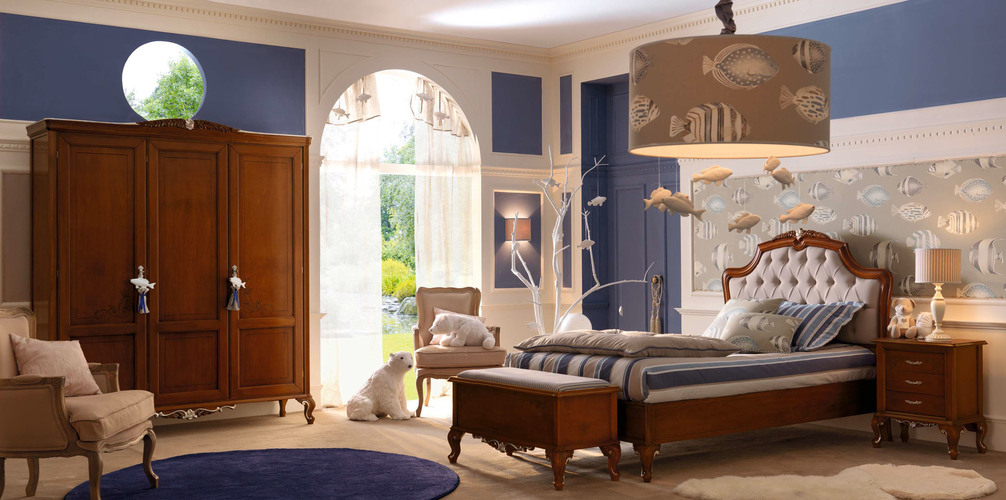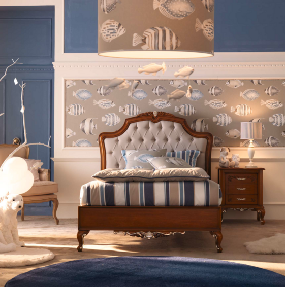 Классический вид этой спальни подчеркивается выбором натурального дерева и декоративной серебряной фольгой, подчеркивающей элегантность резьбы. Вот ансамбль спальни для тех, кто жаждет дизайна, который никогда не выходит из моды, идеальный выбор как для подростков, так и для взрослых. Панно из ткани буазери с изображением элегантных рифовых рыб сочетается по цвету с абажурами и подушками, создавая легкую ливрею. Прикосновение к воздействию темного дерева и придающее динамическую нотку всему помещению.