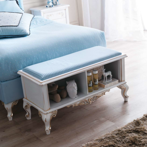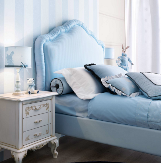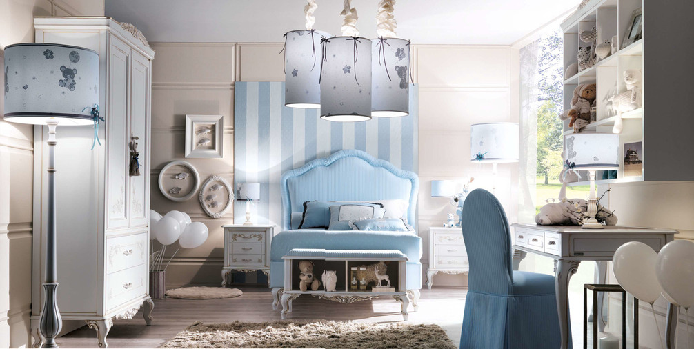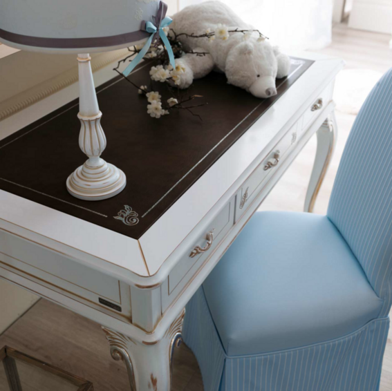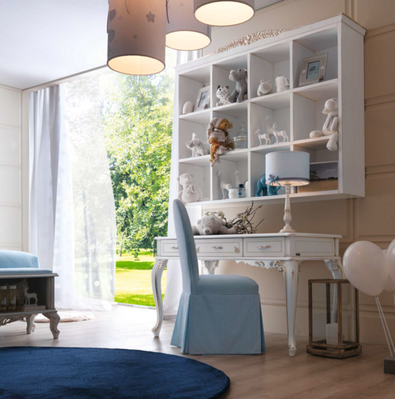 Дети больше всего на свете любят погружаться в мир красок, приключений и захватывающих проектов! Специально для них мы придумали комнату в оттенках неба и моря. Спальня становится больше, чем местом для отдыха: это оазис свободы со специально спроектированным уголком для занятий. Настенная книжная полка над столом — идеальное место для школьных учебников, игр и DVD-дисков. В качестве завершающего штриха рабочий уголок дополняется стулом, обитым тканью в тон, который сочетается с кроватью, скамейкой для хранения вещей и абажуром для ноутбука.