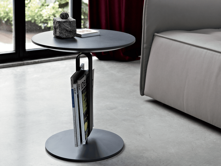 Журнальный столик с подставкой для журналов из лакированной стали, столешница из шпона или лакированного дерева. Доступен в круглой форме и в размере: Ø 45х49