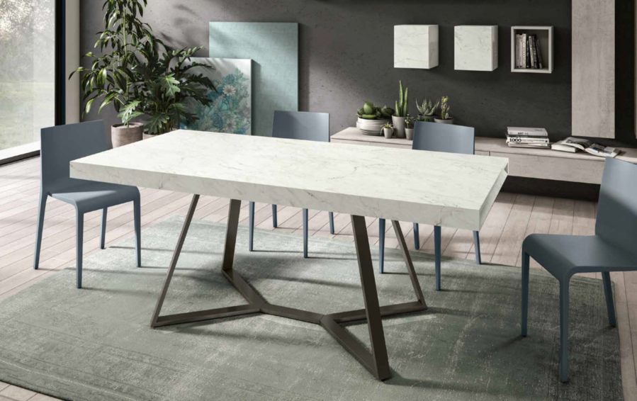 Ambra - это удлиненный стол с телескопической системой открывания и двумя 45-сантиметровыми удлинителями, размещенными во внутреннем отсеке