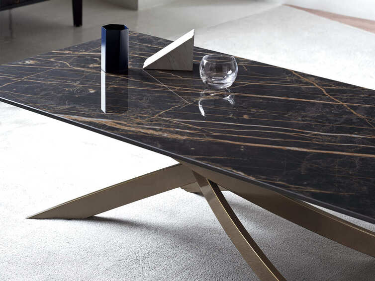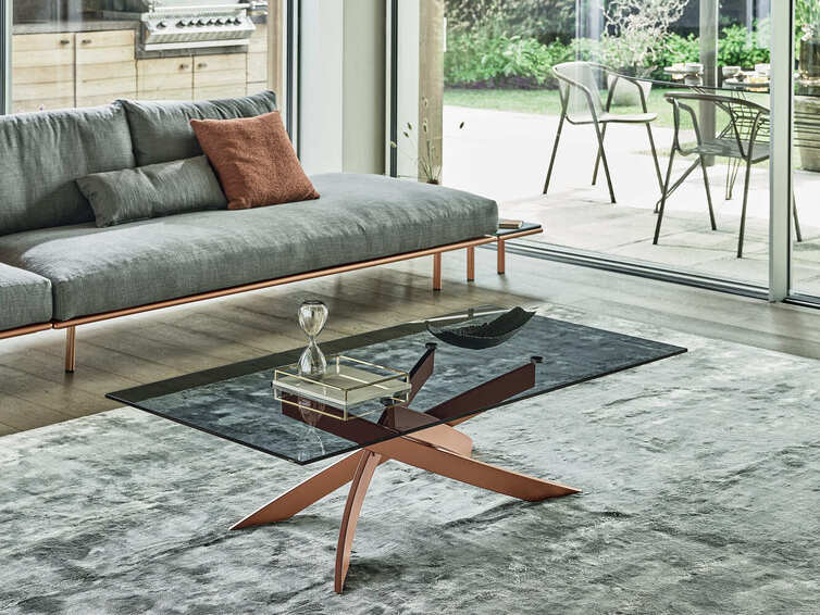 Журнальный столик со структурой из лакированной стали, столешницей из шпона, хрусталя, устойчивого к царапинам хрусталя или супермрамора