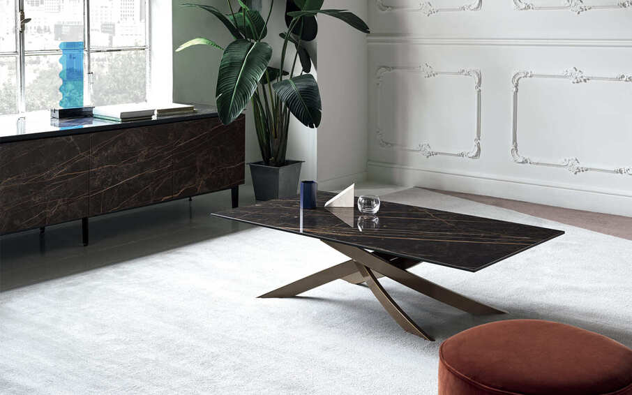 Журнальный столик со структурой из лакированной стали, столешницей из шпона, хрусталя, устойчивого к царапинам хрусталя или супермрамора. Доступен в прямоугольной и круглой форме и в размере: Ø 49х51 Ø 120х40 120х65х40 140х75х40 100х40х40