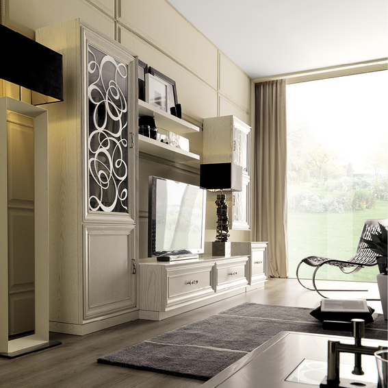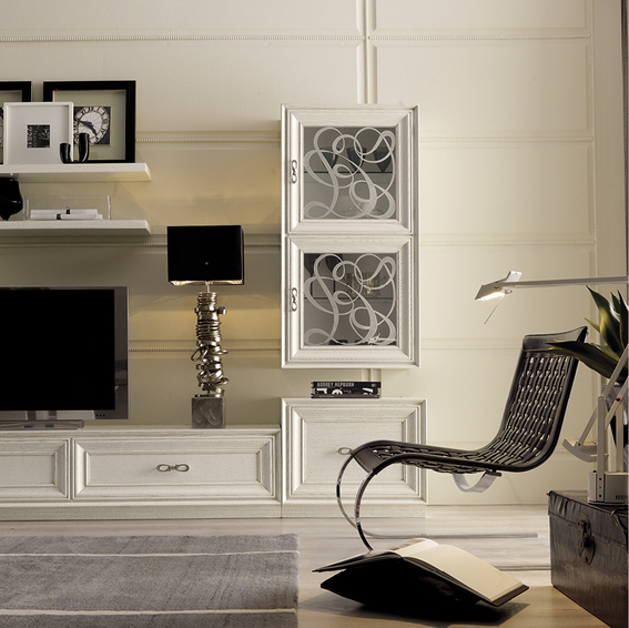 Изысканный дизайн этого навесного шкафа сочетает в себе тумбы с выдвижными ящиками, тумбу со сплошной нижней дверцей и стеклянной верхней дверцей, а также уникальную витрину. Большие поверхности базовых блоков идеально подходят для размещения видео-, ТВ- и стереокомпонентов.