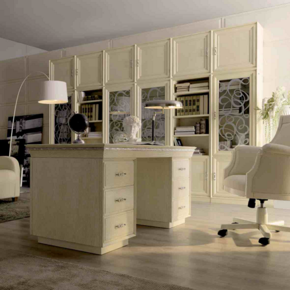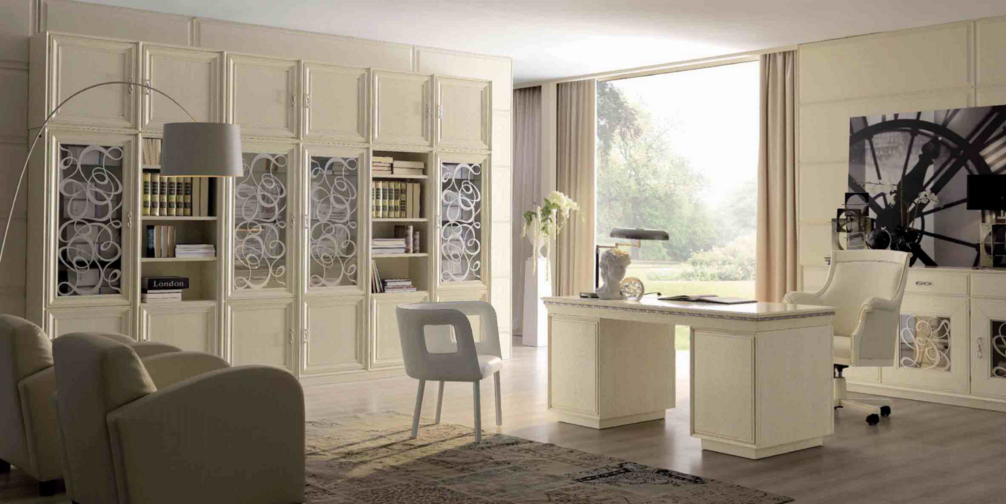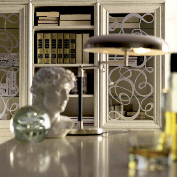 В исследовании модульные компоненты были размещены бок о бок, образуя настенный шкаф/книжную полку с открытыми отсеками и декорированными стеклянными дверцами. Общий эффект — роскошная, чрезвычайно изящная композиция, вращающаяся вокруг центрального стола и мягких стульев.