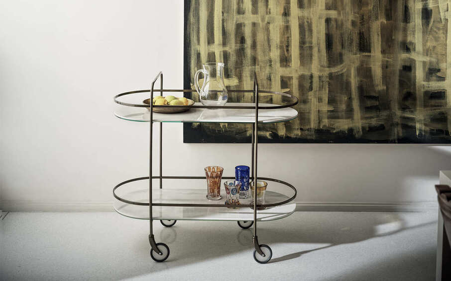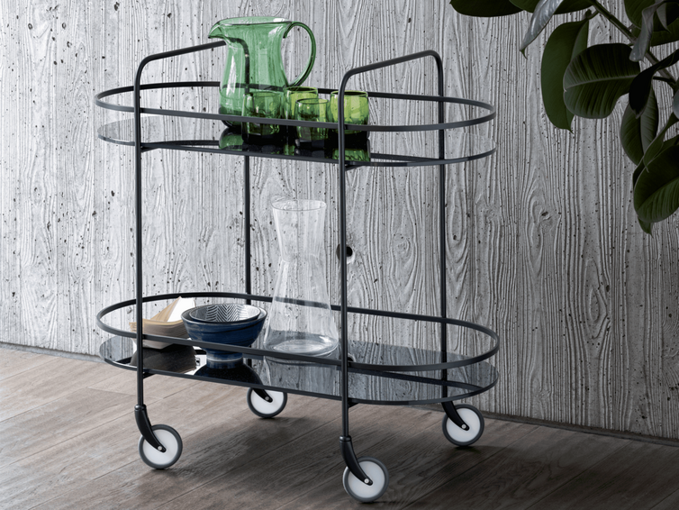 Ланч-бокс на колесиках со структурой из лакированной стали, столешница из глянцевого, матового стекла, устойчивого к царапинам, или кристалла SuperMarble. Доступен в размере: 81х39х75