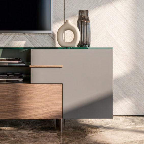 Данный предмет интерьера стал обязательным в современный декор интерьера, доступны здесь в геометрической комбинации отделки. Графит и орех Canaletto разделяют поверхность и расширяют функции и стиль тумбы под телевизор Elle, дополненной изысканной столешницей из зеркального стекла. Тумба под телевизор превращается в вместительный элегантный шкаф для книг и мелких предметов.