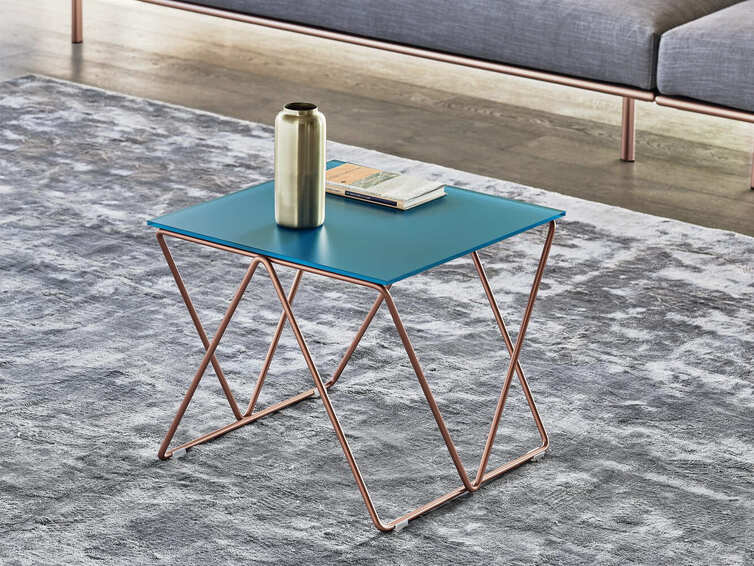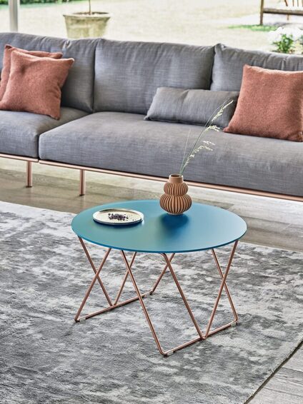 Журнальный столик со структурой из лакированной стали. Кожаный верх. Доступен в прямоугольной форме и в размере: 49х49х43 Ø 69х43 Ø 110х29