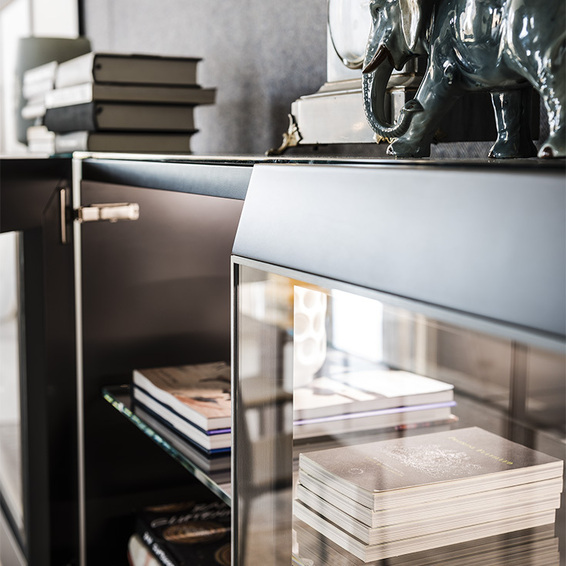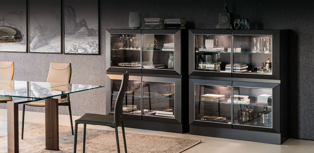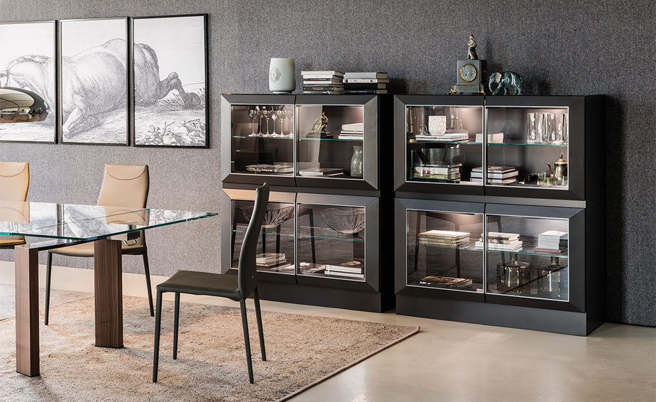 Сервант, витрина с матовой белой или графитовой лакированной рамой. Дверные профили окрашены в белый матовый цвет, графит или орех Canaletto. Двери и внутренние полки из особо прозрачного стекла. Сервант h74 и h139 со столешницей из сверхпрозрачного стекла, окрашенного в белый или графитовый цвет. Дополнительно: комплект внутреннего светодиодного освещения. Доступен в размерах: 122,5x49x74h - 2x1 122,5x49x139h - 2x2 122,5x49x204h - 2x3 184x49x74h – 3x1 184x49x139h - 3x2 184x49x204h - 3x3