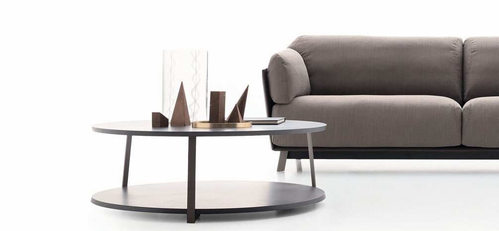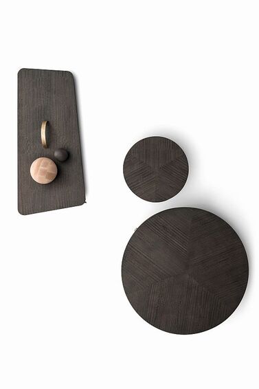 Изящная, но прочная конструкция образует серию круглых столов с одинарной или двойной столешницей. Столешницы выполнены из эвкалипта с закругленным профилем коричневого или пепельно-серого цвета. Скамья с асимметричным контуром становится столешницей, которую можно накладывать на мягкие элементы, а также полезной полкой для журналов и аксессуаром для мини-стола.