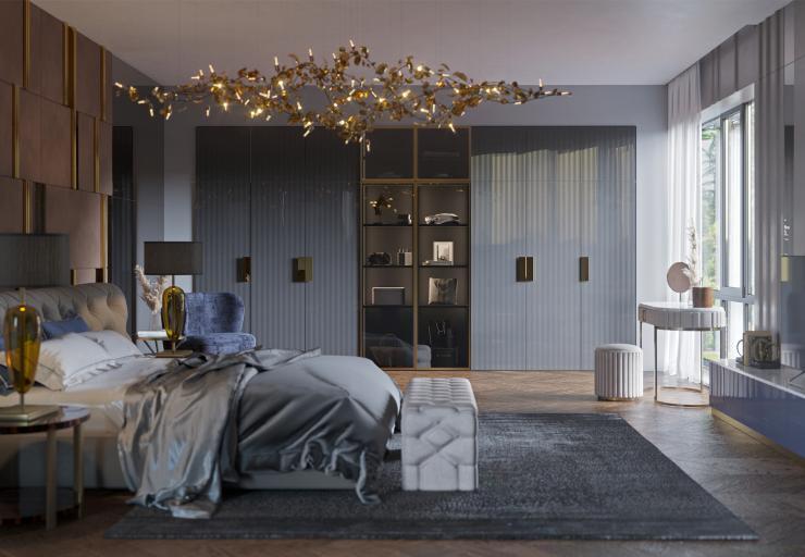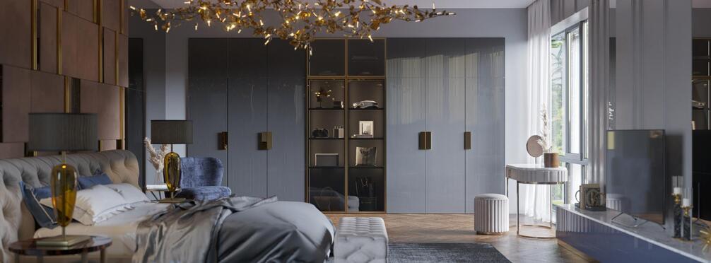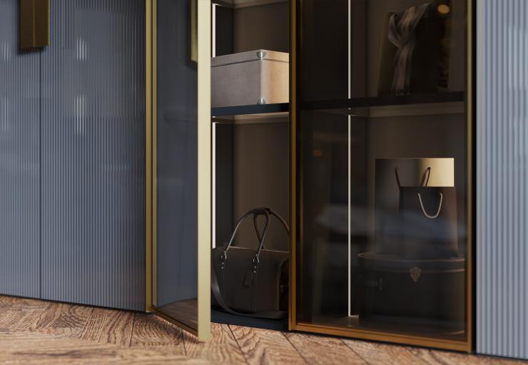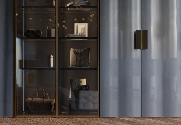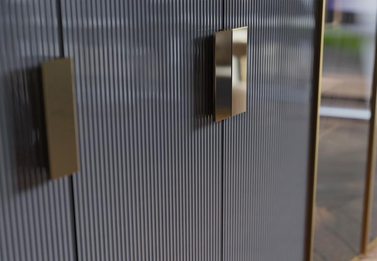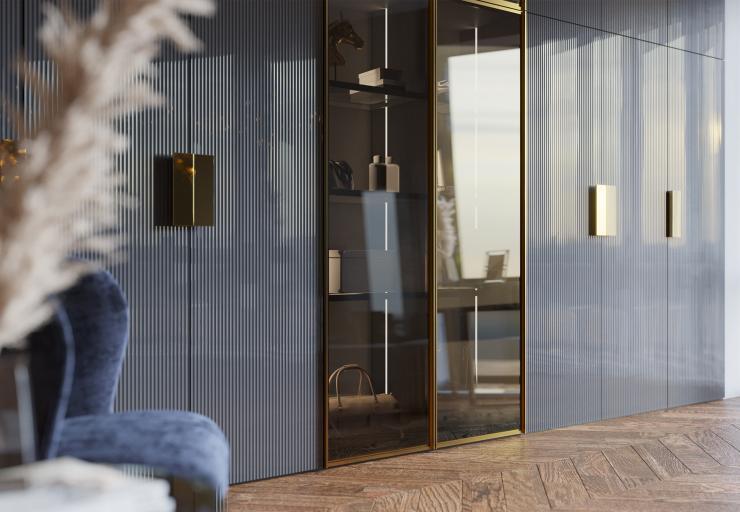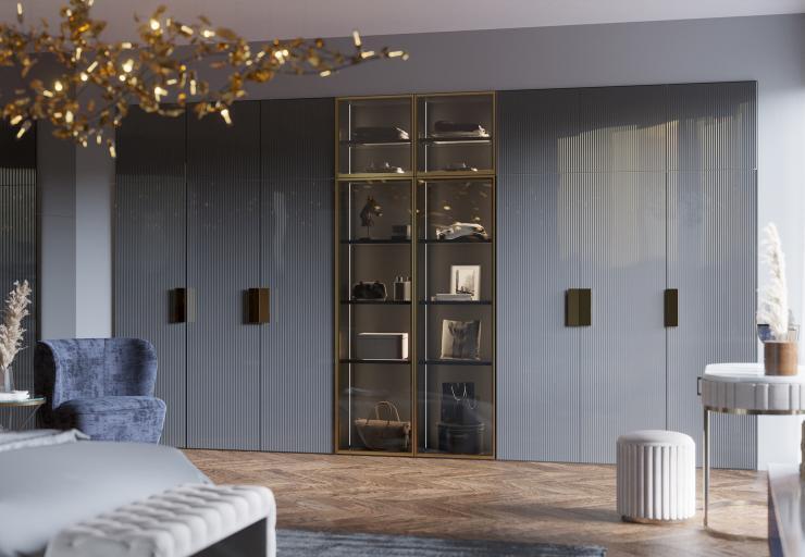 Шкаф «Волна» роскошный и утонченный одновременно, сочетает в себе визуальный шик и сдержанность. Один из главных стилеобразующих элементов шкафа ‒ это рифленый фасад. Элегантность фрезерованного фасада усиливается блеском лаковой отделки «высокий глянец». Рельефный фасад задает ритм и последовательность, визуально увеличивает высоту комнаты, обеспечивает ощущение легкости и гармоничности. Интегрировать такую мебель можно как в современное, так и в классическое оформление. Особый шик шкафу «Волна» придает авторская ручка, которая может быть выполнена как в хромированном, так и золотом покрытии. Для придания легкости и элегантности шкаф «Волна» может быть дополнен стеклянными дверьми MIXAL Glix со вставкой из тонированного стекла с легким зеркальным эффектом в окрашенном алюминиевом профиле В модели «Волна» особый шик внешнего облика органично соседствует с невероятной функциональностью. Распашные створки скрывают удобное содержимое. Наполнение шкафа проектируется индивидуально. Может включать просторные ящики и полки с разделителями, органайзер, штанги, секции для брюк, галстуков, рубашек.