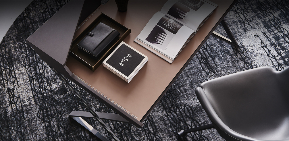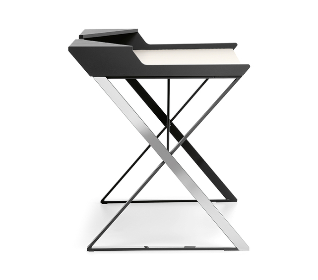 Стол с рамой, окрашенной в матовый графит или белый, и профилем из полированной нержавеющей стали. Столешница из лакированного графитового или белого МДФ с тиснением. Кожаный коврик в соответствии с образцом карты. Доступен в прямоугольной форме и в размере: 120x72x83h