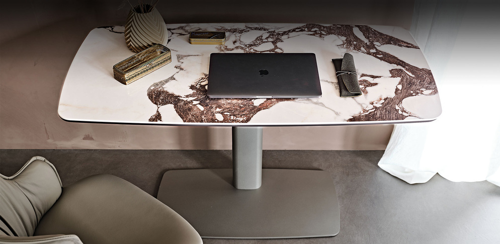Стол с электрической регулировкой высоты. Рама из лакированной стали с тиснением под титан или бронзу. Столешница из керамики Marmi матовая Golden Calacatta, глянцевая Golden Calacatta, матовая Portoro, глянцевая Portoro или Breccia. Доступен в прямоугольной форме и в размере: 118x58x72/110h