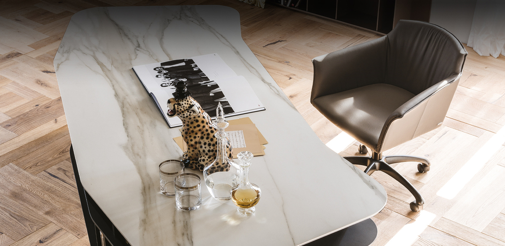 Раздвижной стол с основанием из лакированного МДФ с тиснением под титан, графит или черный цвет. Столешница из керамики Marmi в цветах Alabastro, Supreme, Ardesia, матовая Golden Calacatta, глянцевая Golden Calacatta, матовая Portoro, глянцевая Portoro, глянцевая Sahara Noir, Makalu, Breccia или Arenal. Доступен в прямоугольной форме и в размере: 235x99x75h