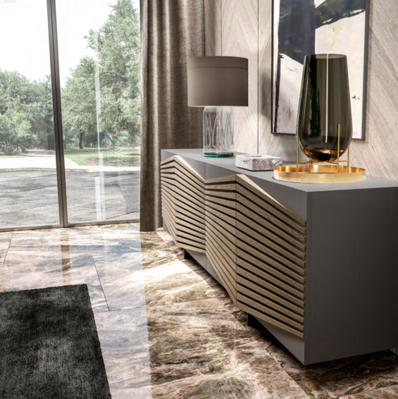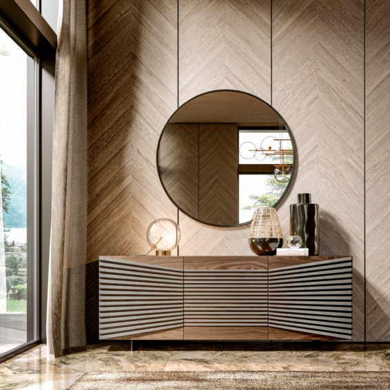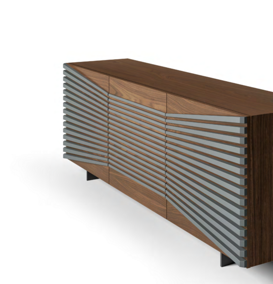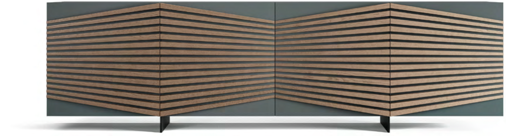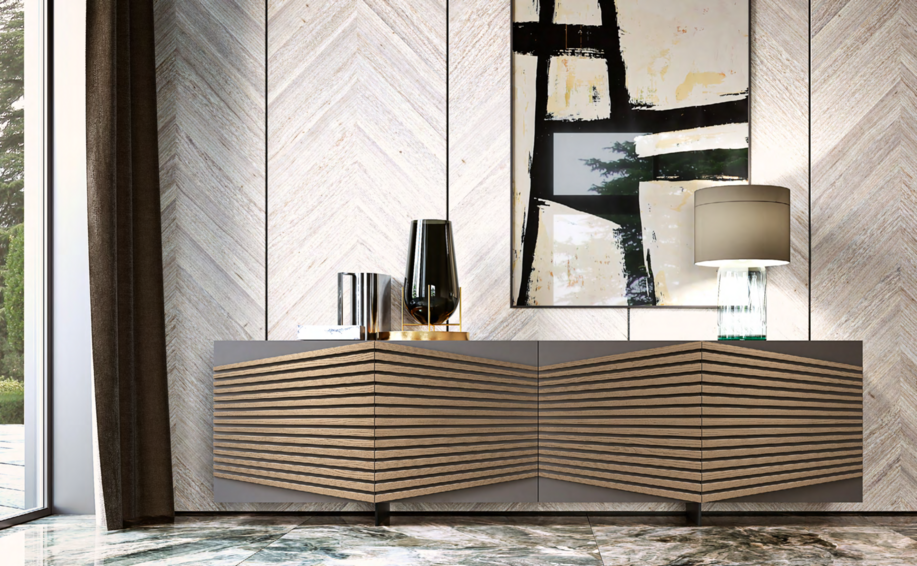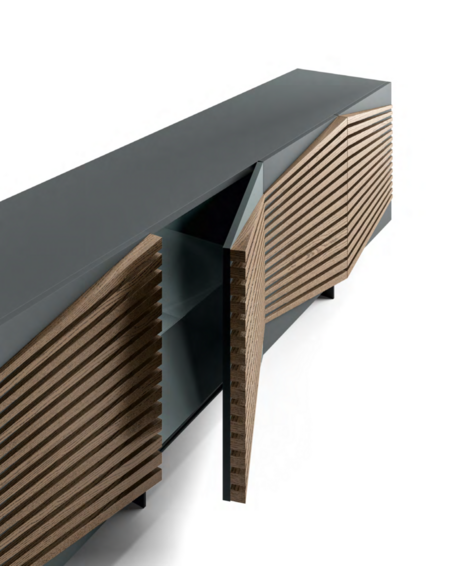 Лучи светло-серого пепла дерево сияет как декор лакированных дверей графитового цвета и структуры современного буфета, создавая соблазнительный оптический эффект. Детали идеальны внутри и снаружи с элегантными полками из листового стекла, также доступными в отделке из ореха Каналетто и олова. Оптическая схема Геометрический орнамент Рэя меняет направление в трехдверной версии, который также доступен с планками из светло-серого ясеня и структура графита.