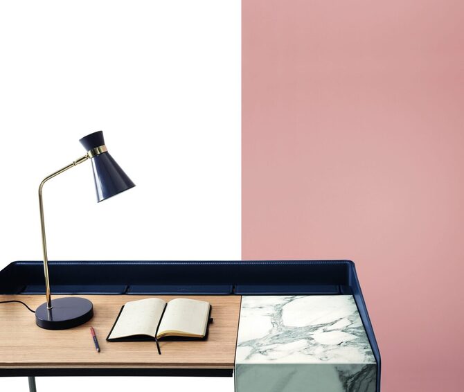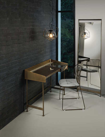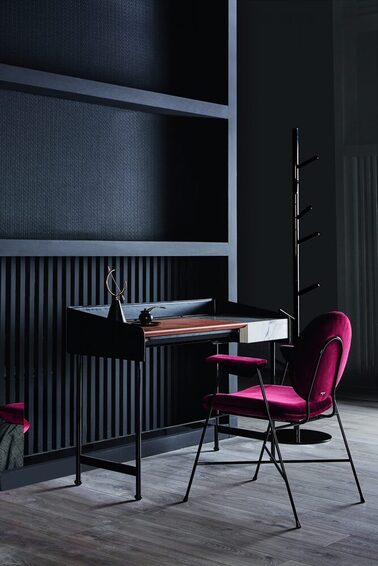 Письменный стол со структурой и внешней лентой из лакированной стали или с внешней лентой из кожи, с 3 дверцами для предметов из кожи в сочетании с внешней лентой, состоящей из деревянной столешницы, откидной дверцы для потайного отделения из лакированного дерева или супермрамора. Доступен в прямоугольной форме и в размере: 112х50х76/85