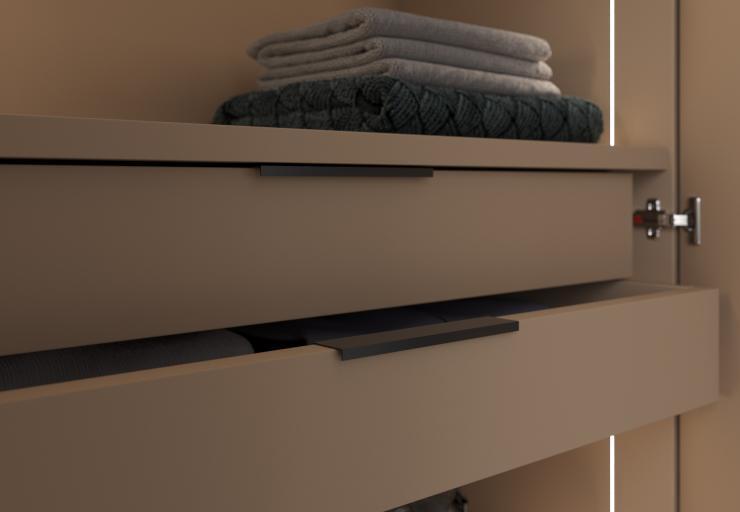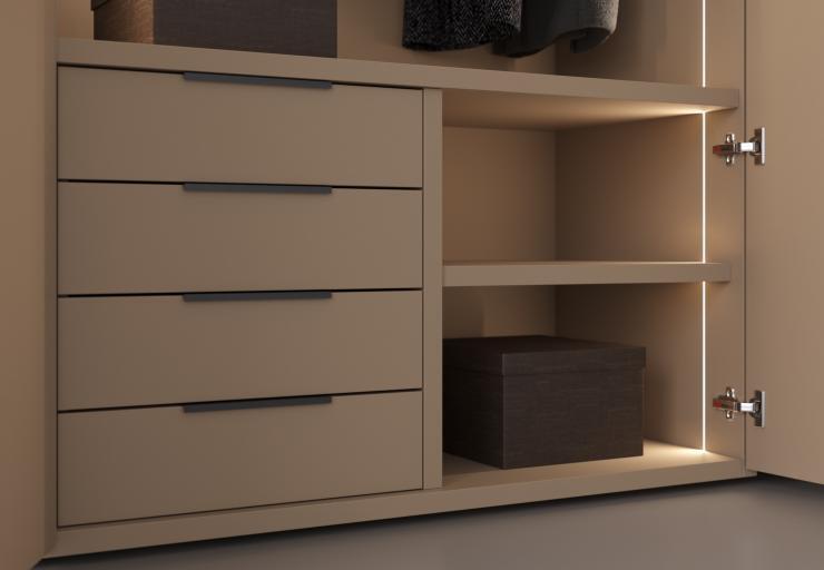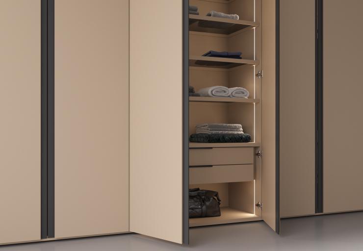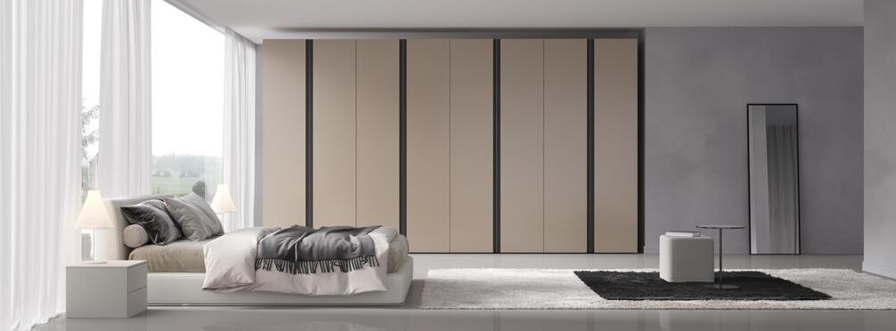 Абсолютная новинка от компании АТЛАС-ЛЮКС – программа платяных шкафов и гардеробных. Модульная система разработана с максимальной вариативностью: можно выбрать отдельно стоящий шкаф или набор из двух-трех, или обустроить полноценную гардеробную комнату. Модули могут быть без фасадов, с комбинированными, глухими и стеклянными дверями. Отличительной особенностью модели «Лацио» является полоска, которая протянулась вдоль всей высоты двери. Она может быть окрашена в любой цвет по палитре RAL и NCS в глянцевом и матовом исполнении, а также фанерована различными видами натурального шпона. Такая вставка выполняет одновременно роль ручки и изящного декоративного элемента.