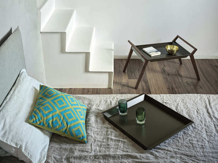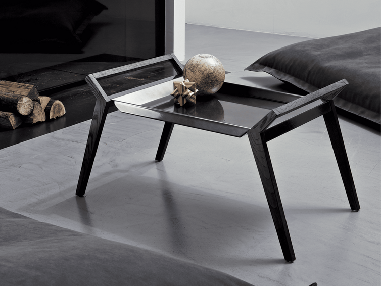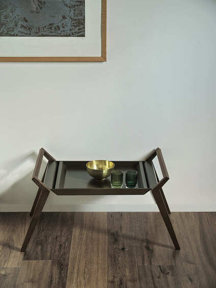 Журнальный столик со структурой из массива дерева, столешницей из лакированной стали. Дополнительный алюминиевый поднос. Доступен в прямоугольной форме и в размере: 78х47х43 98х47х43