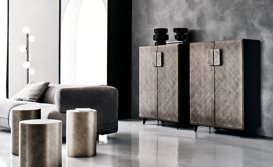 Буфет из тисненого лакированного графита, черного, дерева Брашированная бронза или Серого матового дерева, с дверцами из дерева Брашированная бронза или Серого матового дерева. Ножки из лакированной стали с тиснением под графит или черного цвета. Частично зеркало внутри и полки из дымчатого стекла. Дополнительно: комплект внутреннего светодиодного освещения. Доступен в размерах: 90x43x128h