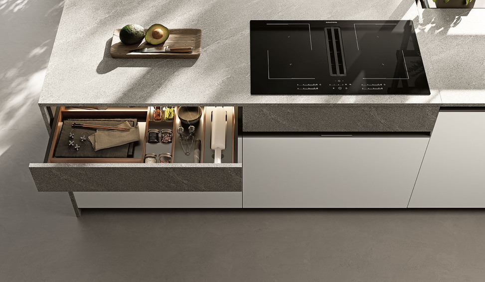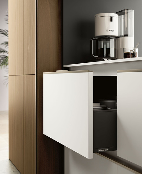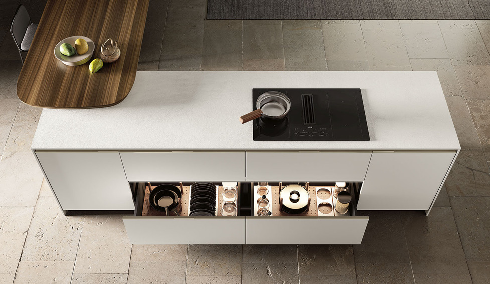 Дверь с алюминиевым профилем является характерным элементом системы: стройная линия с эргономичным увеличением сечения расположена перед плоским или фигурным пазом ручки, что позволяет достичь превосходного функционального и эстетического результата. Алюминиевый профиль задает ритм кухни: розетка располагается по центру в цокольных шкафах с ящиками, корзинами или посудомоечными машинами, определяя их геометрическую величину. В базовых блоках с распашными дверцами захват расположен сбоку и за счет смежной связи с другими распашными дверцами задает более строгие формы. Колонны расположены вертикально, раскрывая всю свою функциональность и эстетичность.