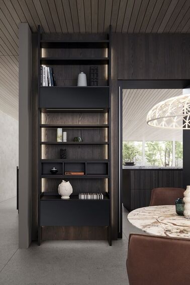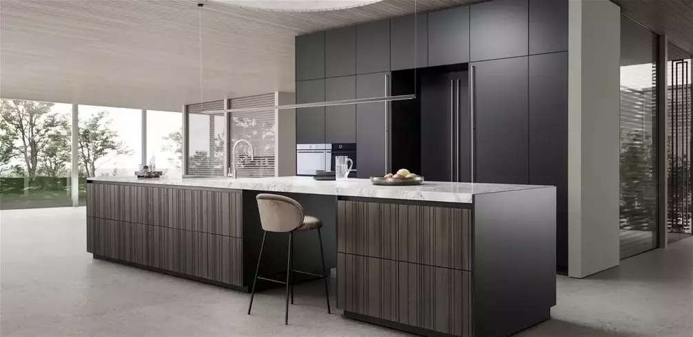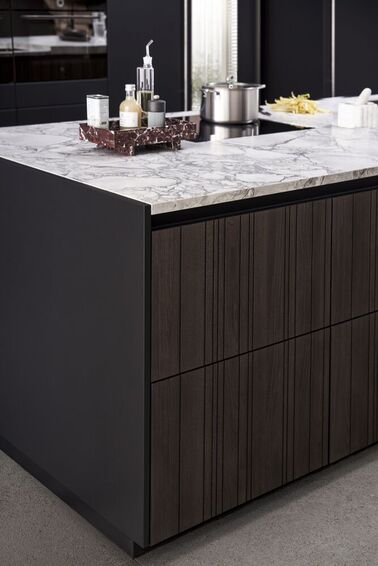 Последней инновацией является фасад из шпона с эффектной поверхностью, созданной за счет структуры вертикальных канавок. Таким образом, BAHIA опирается на успешную программу BOSSA от LEICHT, но отличается ключевым принципом дизайна: помимо контраста между выступающей поверхностью и самими канавками, особенностью BAHIA является сочетание двух кажущихся противоположностей. В пределах любого одного фронта отдельные бороздки расположены асимметрично друг другу, но в последовательности нескольких фронтов возникает одинаковая веерная структура.