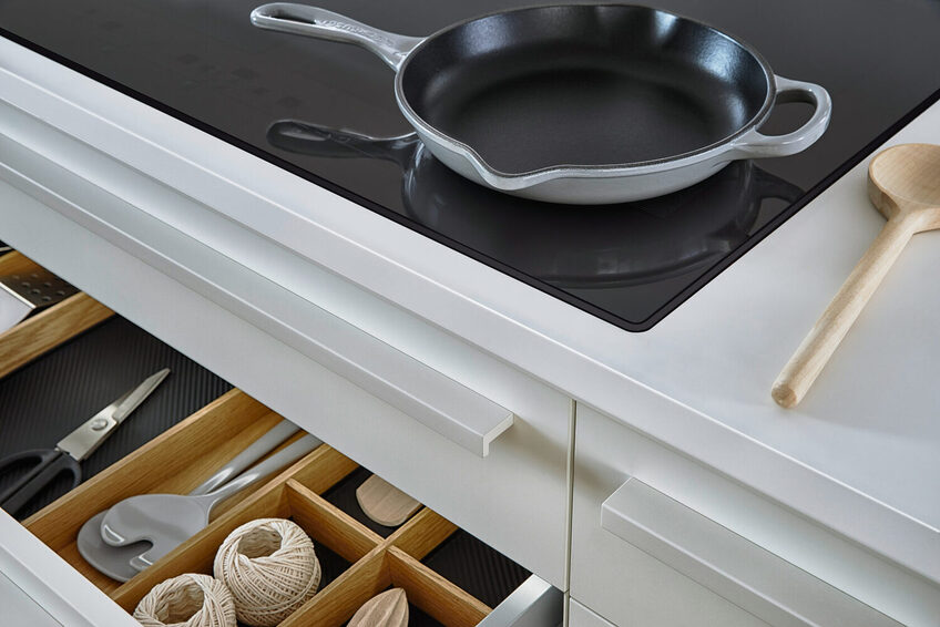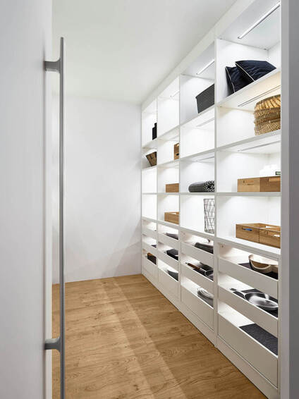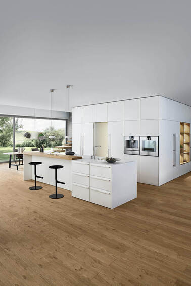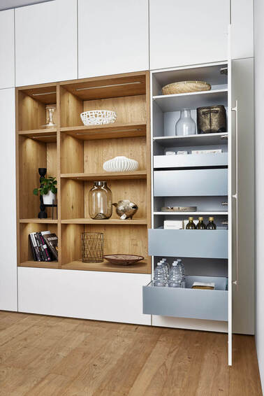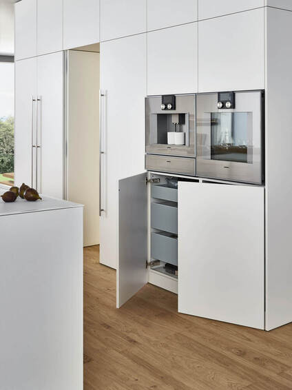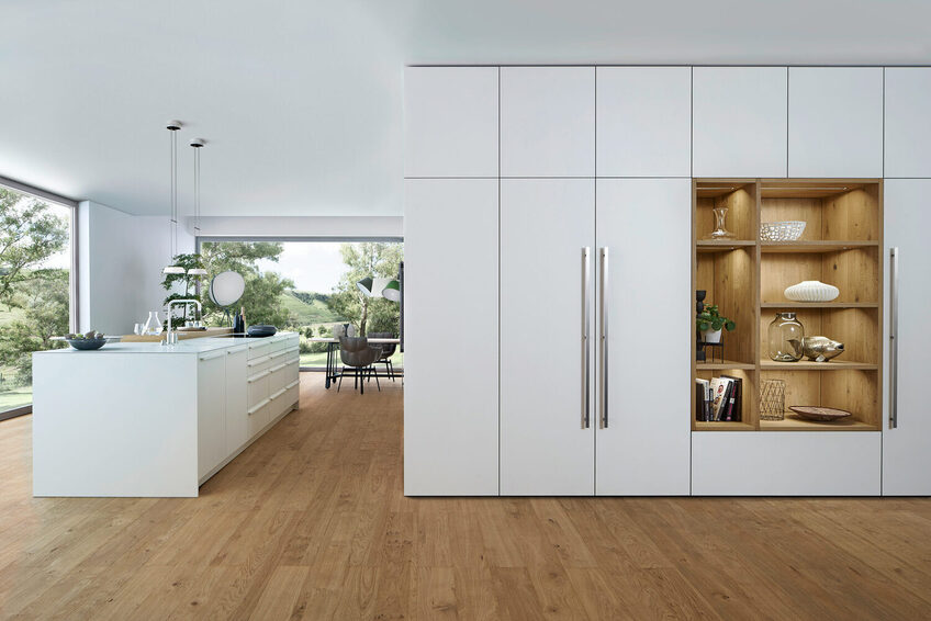 Перед вами высококачественное матовое покрытие BONDI, которое является невероятно популярным среди клиентов по всему миру, но это не главное в этой композиции. Главное - концепция Raum in Raum (помещение в помещении), которая позволяет элегантно скрыть вспомогательные зоны внутри кухни. Идеально подходит для больших домов с открытой планировкой.