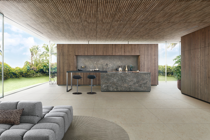 Благодаря облицовке безручечных кухонных рядов и шкафов с помощью программы BOSSA в грецком орехе решения для хранения принадлежностей равномерно исчезают за фронтом из натурального дерева, который полностью формирует большие площади