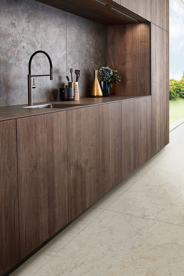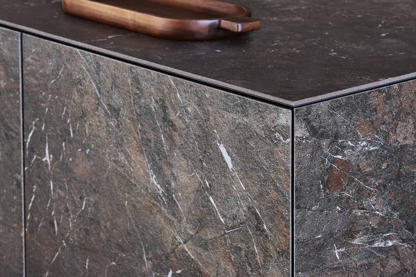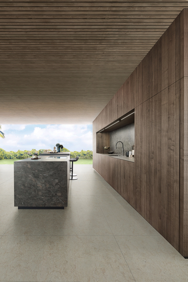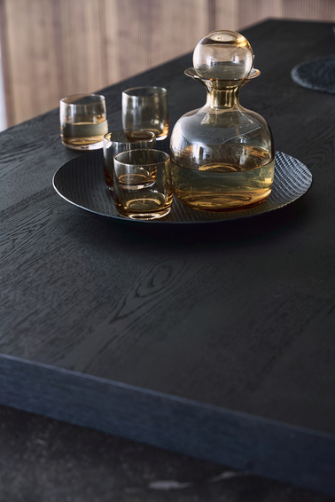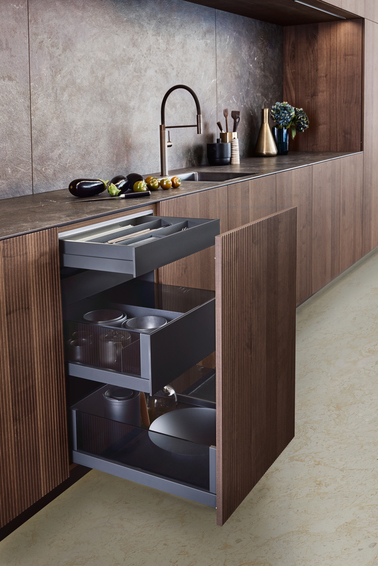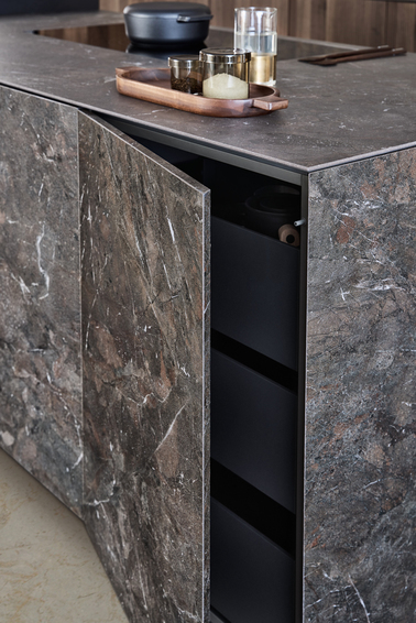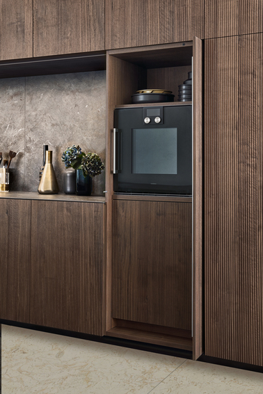 Благодаря облицовке безручечных кухонных рядов и шкафов с помощью программы BOSSA в грецком орехе решения для хранения принадлежностей равномерно исчезают за фронтом из натурального дерева, который полностью формирует большие площади. В этой планировке отдельно стоящий перед кухонным гарнитуром островной блок, а также столешницы изготовлены из высококачественной керамики Корпус в нововведенной высоте 86 см подчеркивает кубическую оптику в диалоге с вертикальными линиями BOSSA Внутренняя отделка каждого элемента в новом цвете корпуса сером карбоне также тонко вписывается в концепцию темного цвета . Такие детали, как подобранная по цвету фурнитура, завершают общую картину.