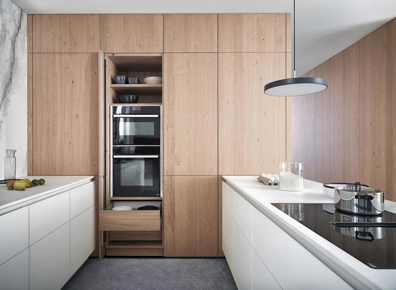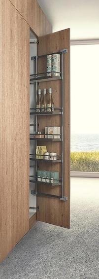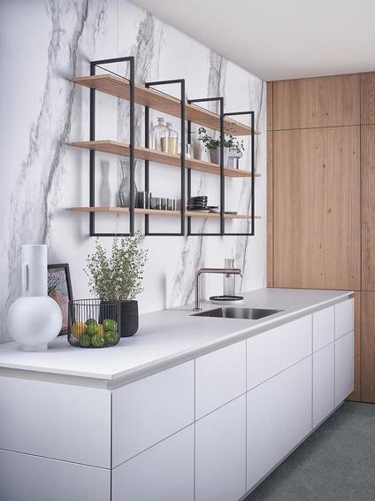 Здесь находят свое место облицованные при помощи BOSSA модули высоких шкафов с выдвижными полками и задвижными дверями. Благодаря поверхности эти безручечные модули воспринимаются как элементы домашнего уюта, а зона приготовления пищи визуально воспроизводится на обоих кухонных рядах. Модульная система стеллажей FIOS благодаря новой конструкции стойки доступна в качестве свободно висящего настенного элемента.