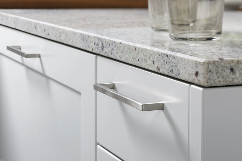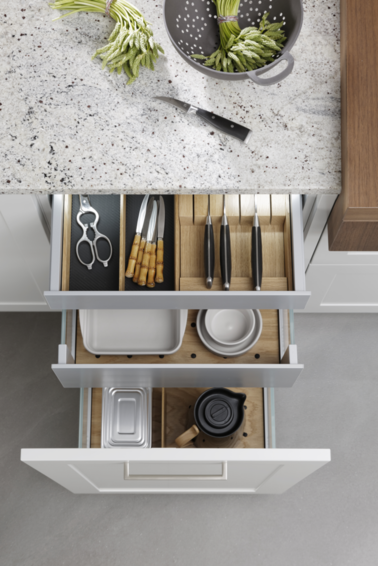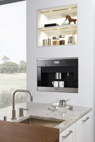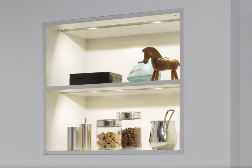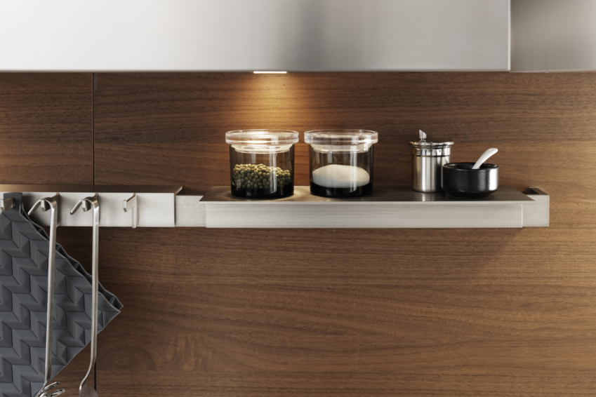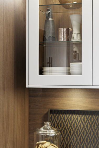 Модель кухни CARRE-FS выполнена в традиционном стиле. Скромность в элементах отделки, строгие и изысканные рамочные фасады, глубокие и чистые цвета наполняют помещение атмосферой простоты и домашнего уюта. Фронты декорированы матовым лаком белого цвета. В тон к ним подобраны массивные светло-серые столешницы из камня и элегантные металлические дверные ручки . С двух сторон кухонного острова расположились открытые полки. Вмонтированная мойка и смеситель белого цвета прекрасно гармонируют и как бы сливаются с кухонным гарнитуром. Напротив мойки расположилась газовая плита. Вместо стандартного трехуровневого модуля дизайнеры компании Leicht использовали конструкцию, в которой навесные шкафы располагаются прямо на столешнице. Ниша и внутреннее пространство застекленных шкафов оборудованы LED-освещением. Открытая полка создает дополнительное место для хранения. Электроприборы скрыты за глухими фасадами высокого напольного модуля. Посередине шкафов располагается открытый стеллаж с LED-светильниками. Напольный модуль выполнен в светло-сером цвете и имеет матовую лаковую поверхность. По желанию, кухонный гарнитур CARRE-FS может быть изготовлен в любом стандартном цвете шкалы RAL.