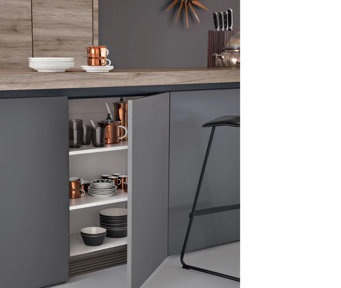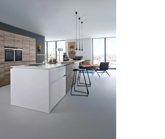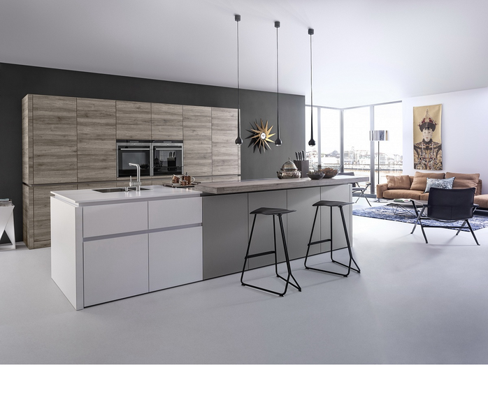 Кухня Leicht Synthia-C ǀ Ceres-C выполнена в спокойных матовых фасадах и фасадах, реалистично имитирующих древесину. Фасады, опущенные до пола, скрывают за собой стандартный цоколь и позволяют сделать мебель менее похожей на традиционную кухню.
