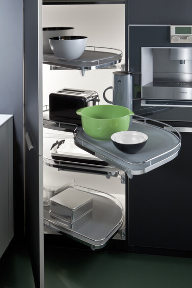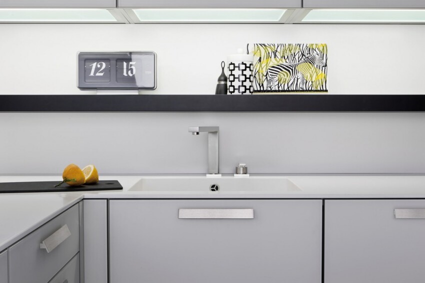 максимальное использование свободного пространства благодаря шкафам до пола, скрывающим кухонный цоколь; фантастический контраст черного и снежно-белого в цветовой палитре превосходит даже самые экстравагантные фантазии любителей «изюминки»; выезжающие платформы в шкафах при кажущейся компактности позволяют разместить любую кухонную утварь максимально удобно.
