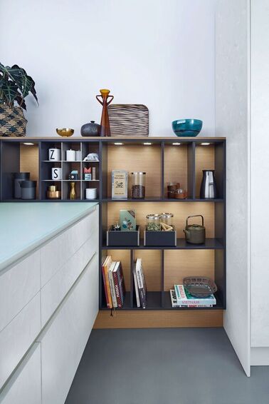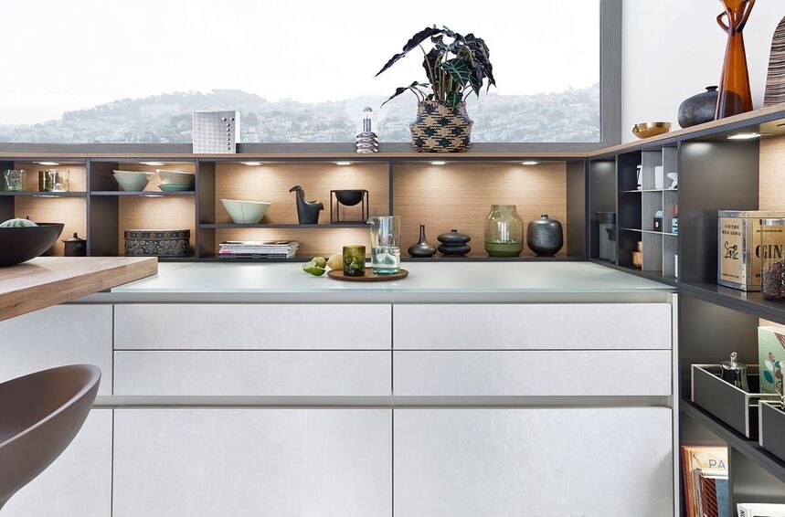Материал и цвет этой кухни излучают вневременную эстетику: CONCRETE дакар, бетон в прерывающемся белом цвете в качестве материала фронта, поверхность мелко структурирована благодаря нанесению вручную. Модульный наставной стеллаж со светлой задней стенкой из дерева оформляет стену над столешницей.