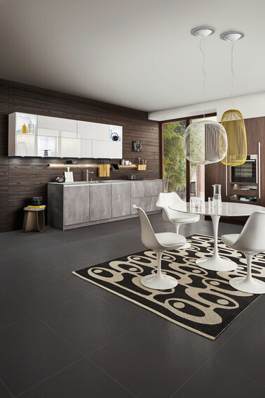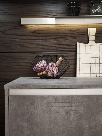 Концепция интерьера, состоящая из варочного блока, верхних шкафов и высокого шкафа, уютно дополняется за счет облицовки задней стенки из мелко структурированного натурального дерева. Как в дизайне интерьера, так и в оформлении поверхности проявляется большое разнообразие. Привлекающими внимание являются нижние шкафы в благородной репродукции бетона.