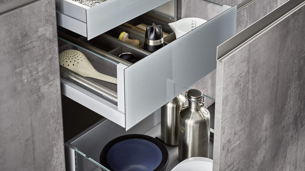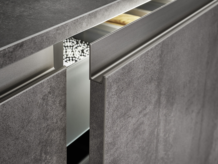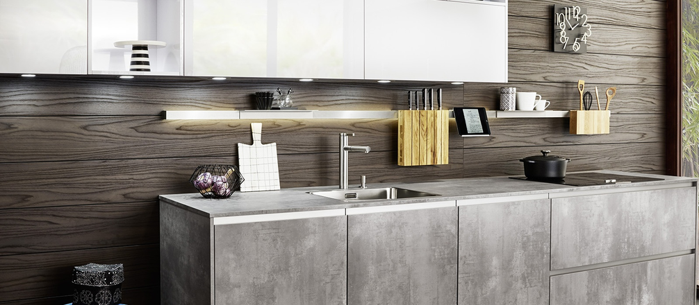 Кухня SIRIUS | IKONO | SYNTHIA демонстрирует все самые актуальные разработки немецкой фабрики LEICHT для планирования открытой кухни-гостиной. Связующим звеном в данной композиции выступает стена, полностью обшитая стеновыми панелями. В отличии от аналогов для крепления данных панелей не нужно возводить дополнительные несущие конструкции, они просто клеятся на стену. Визуальное объединение пространства реализовано за счет используемых фактур. Фасады высоких колонн и панели изготовлены из структурированного ламината с фактурой темного ореха, нижние шкафы – с имитацией бетона. Глянцевые лаковые поверхности выполнены в арктическом белом цвете. В зоне кухонного фартука находится рейлинговая система MODO со встроенной подсветкой, здесь можно хранить масла, специи, кухонные инструменты и т.д. В навесные шкафы встроены открытые ниши с LED-светильниками. Высокие колонны облегчены за счет открытых выдвижных ящиков. В данной модели использовано несколько систем открывания: от нажатия, интегрированные ручки и ручки-рейлинги. Внутреннее пространство четко структурировано за счет контейнеров, вставок и разделителей. Для хранения крупногабаритных предметов, например для ящиков с напитками, предусмотрены специальные держатели.