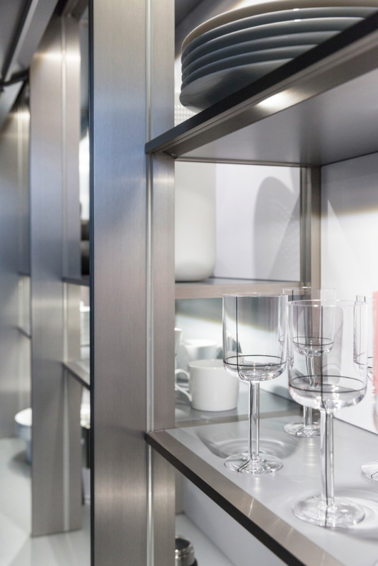 Кухонный гарнитур в современном стиле. Фасады нижних шкафов из программы IOS-M выполнены из стекла. При отделке могут использоваться новые цвета: куркума (горчично-желтый), шафран (матовый оранжевый), петрол (сине-зеленый), которые были впервые показаны на выставке Eurocucina. Столешница из стекла толщиной 12 мм. Ящики и дверцы оснащены механизмом открытия от нажатия. Гарнитур можно оборудовать блоком для подключения iPhone, усилителем и колонками. Новинка-2012. Была представлена на апрельской выставке Eurocucina, которая проходит в рамках i Saloni Milano в Милане (Италия).