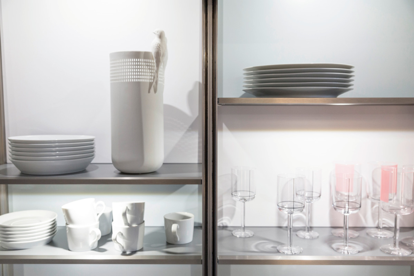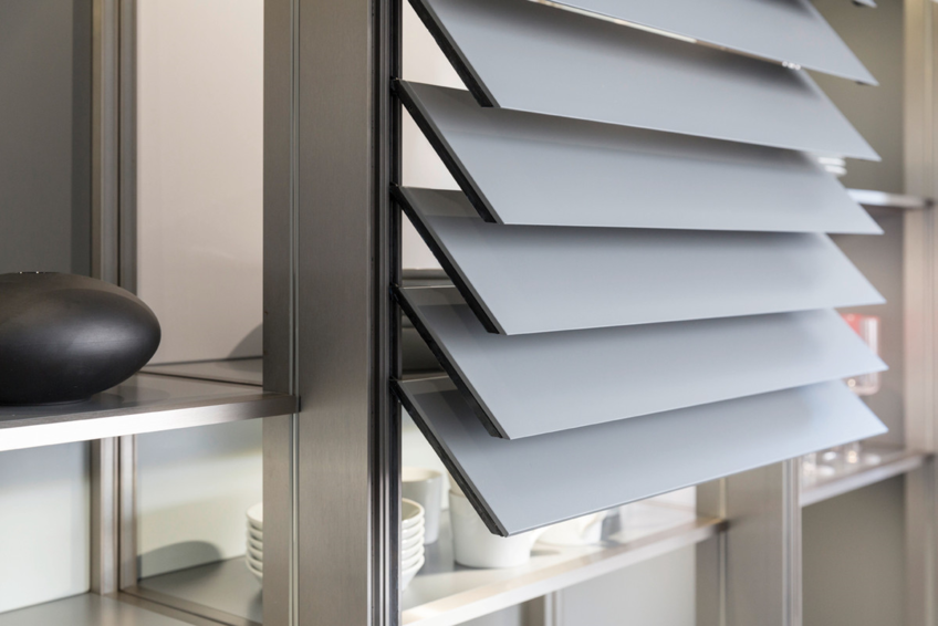 Это современное и молодое сочетание цветов и материалов с матовым стеклом и глянцевым лаком, приглушенный сине-зеленый и светло-серый привносит в комнату свежее и освежающее настроение.