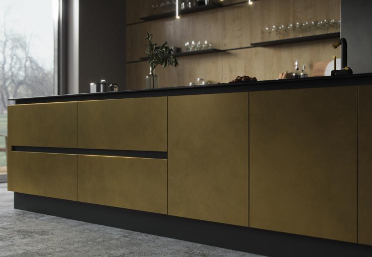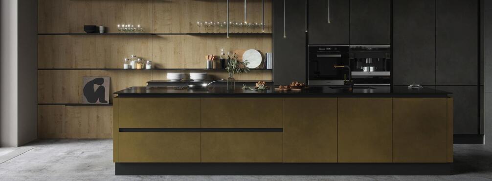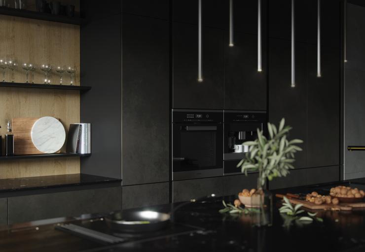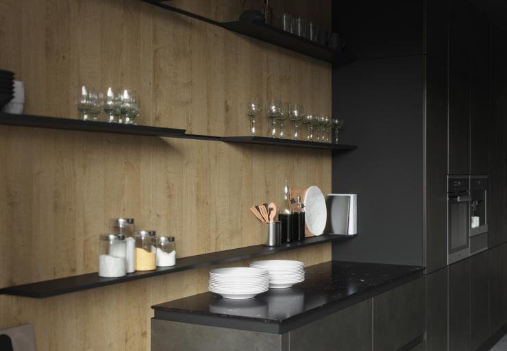 Встроенная бытовая техника, профессиональное оборудование, большие вытяжки и мойки — все выглядит органично, подобрано со вкусом и создано для вашего удобства. Все, что нужно — всегда под рукой. Все, что не используется — скрывается от посторонних глаз. Монохромный графитовый цвет дополняет динамичный и цельный образ. Инновационная отделка фасадов с имитацией неотполированного металла подчеркивает стиль каждой линии. Фасады отличаются асимметричностью, но задуманной, — все находится в визуальной гармонии. Дизайнерские элементы делают стиль нетривиальным — дверцы шкафов с узорчатым стеклом, фартук кухни из акрилового камня. Модные стеклянные и металлические поверхности создают ощущение легкости. При этом они и красивы, и обладают высокой прочностью, практичны и просты в уходе. Такой современный дизайн никто не назовет скучным. Сами по себе ровные поверхности становятся выразительными акцентами, особенно в сочетании с деревом. Обстановка в «Фабрике» лишена громоздкости. В ней Вы цените комфорт, практичность и стиль.