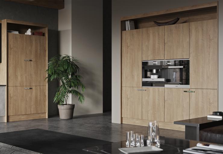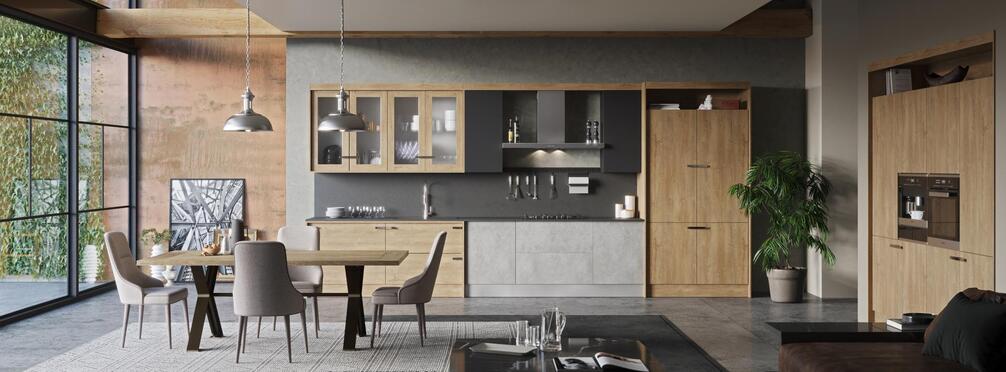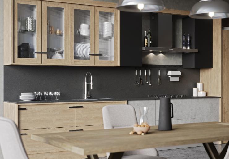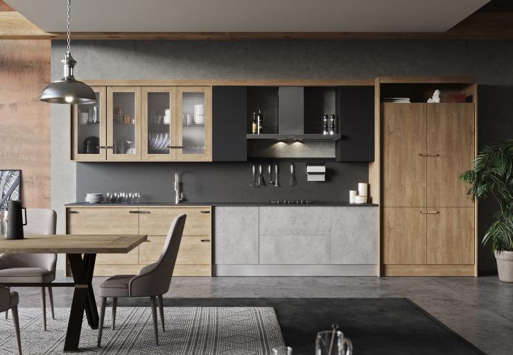 Стиль «Лофт» – это небрежная эстетика мегаполисов. В модели «Лофт» от фабрики «АТЛАС-ЛЮКС» уместно сочетаются все элементы, характеризующие этот стиль. Она вобрала в себя все детали, декоративные приемы и дизайнерские решения, все что свойственно лофтовой эстетике. Кухня «Лофт» соединила в себе все самое дерзкое и брутальное от свободы промышленных идей, наполнив эту модель очарованием старины. Современные фактуры – хром, стекло, сталь, соседствуют со старыми урбанистическими предметами – необработанный бетон, кирпичная кладка, дерево. Эпатажный декор сквозит в каждой детали. Выдвижные ящики без ручек стилизованы под сбитые доски. Под одной из рабочих зон прячется полка для бутылок. Так, ни в одном элементе не нарушается баланс функциональности и красоты. Брутальность композиции придают металлические фальш-болты и петли. Кухня «Лофт» заметна объемными фасадами с рамками. В интерьер добавлены открытые полки с подсветкой, куда так и хочется поставить баночки с конфетами, крупами и специями. В пространстве появляются необычные грифельные доски – на таких ещё в прошлом веке писали самые лучшие рецепты в кафе – модное решение сегодняшнего дня.