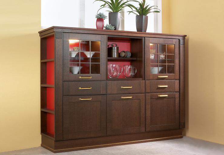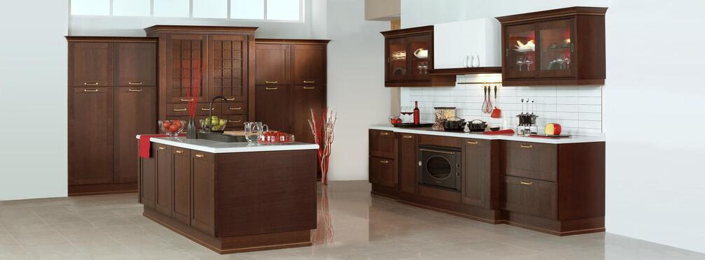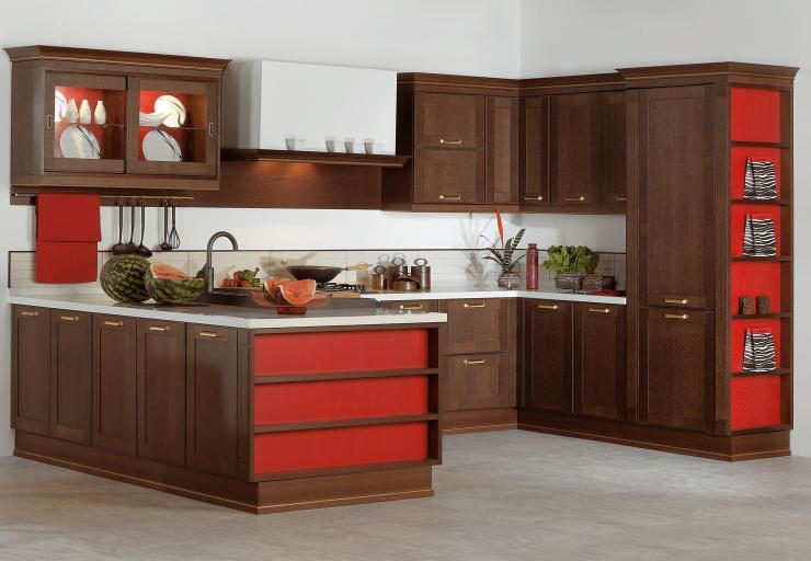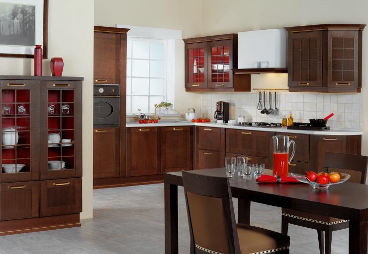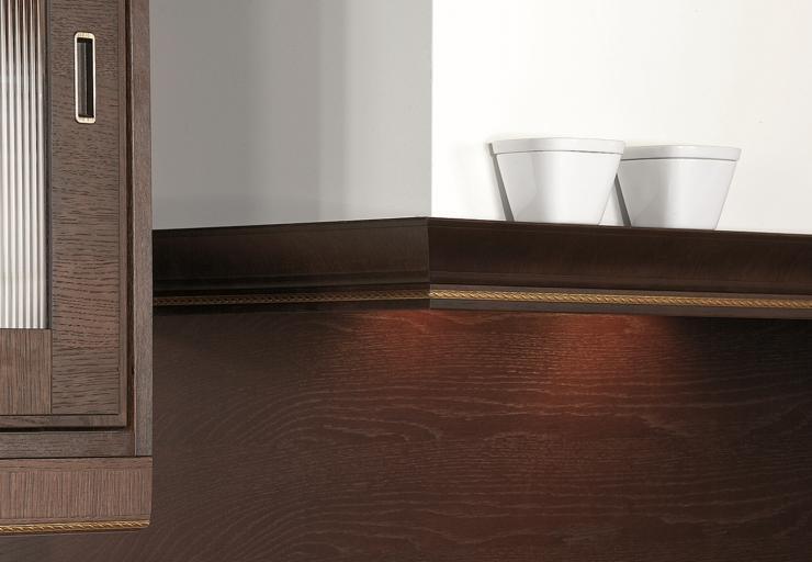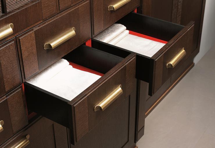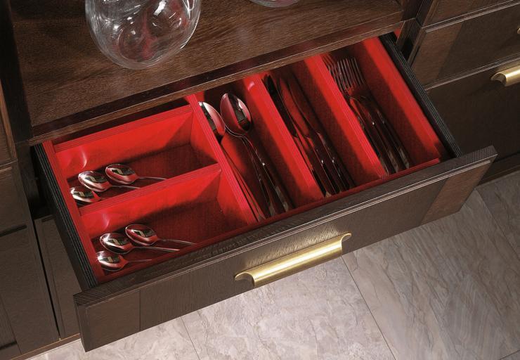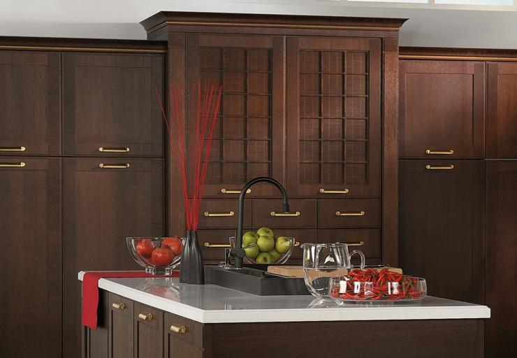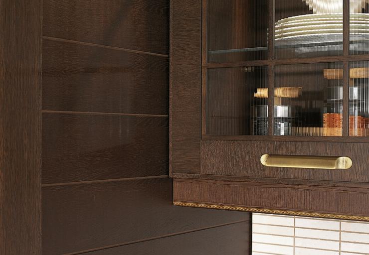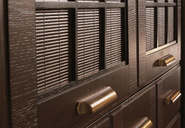 Для этой кухни характерно удивительное сочетание казалось бы не сочетаемых вещей. Классические карнизы и состаренные бронзовые ручки здесь соседствуют с современной строгостью и чистотой линий, а элементы колониального стиля органично вплетены в помпезную роскошь стиля «ар деко». И из всего этого многообразия рождается необыкновенно яркое, утонченное и очень гармоничное восприятие модели – традиционной по форме и современной по содержанию. Дубовые дверцы покрашены в темный цвет африканского дерева венге, а вставки из стеблей тростника напоминают об островах юго-восточной Азии. Решетки с квадратными ячейками и ярко-красная внутренняя отделка шкафов – очевидная дань древней китайской традиции, а в золотом декоре, в свою очередь, читаются индийские мотивы. Массивные бронзовые ручки, покрытые патиной, узорчатое стекло, кессонные углубления на шкафах и деревянные решетки — каждый элемент создает необычный и уникальный образ модели «Наутика».